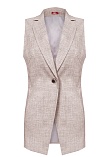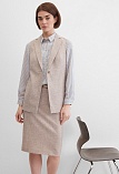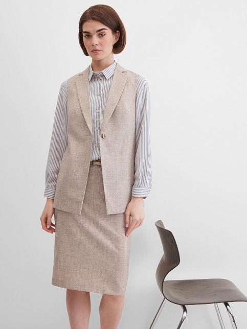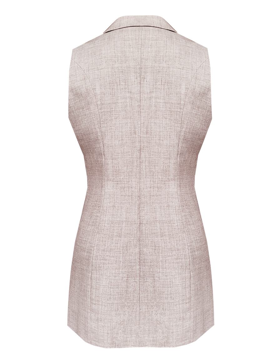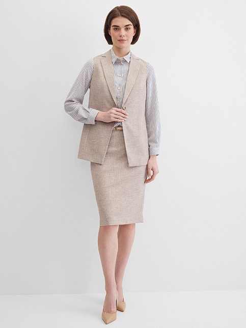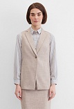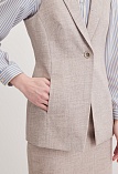 Классический базовый жилет из поливискозной ткани в одном из самых востребованных оттенках нейтрально-бежевого цвета с легким меланжевым эффектом, комфортная длина прикрывающая бедра, приталенный, однобортный, английский воротник, аккуратные внутренние карманы в рельефе почти незаметны, выглядят эстетично и не нарушают линии силуэта, застежка на одну пуговицу, модель на подкладке. Поливискозная ткань - смесовая ткань, в состав которой входят волокна вискозы и полиэстера.