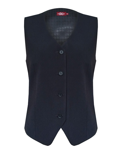 Короткий классический жилет из костюмной ткани в базовом черном цвете по передней части и гладкой подкладочной ткани по спинке, благодаря такой комбинации жилет стал более легким и комфортным в носке, сохраняя при этом классический внешний вид, однобортный, приталенный, застежка на пуговицы, v-образный вырез горловины, хлястики на спинке позволяют регулировать ширину изделия по талии, модель без карманов, полочка на подкладке по изнаночной стороне.