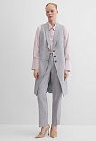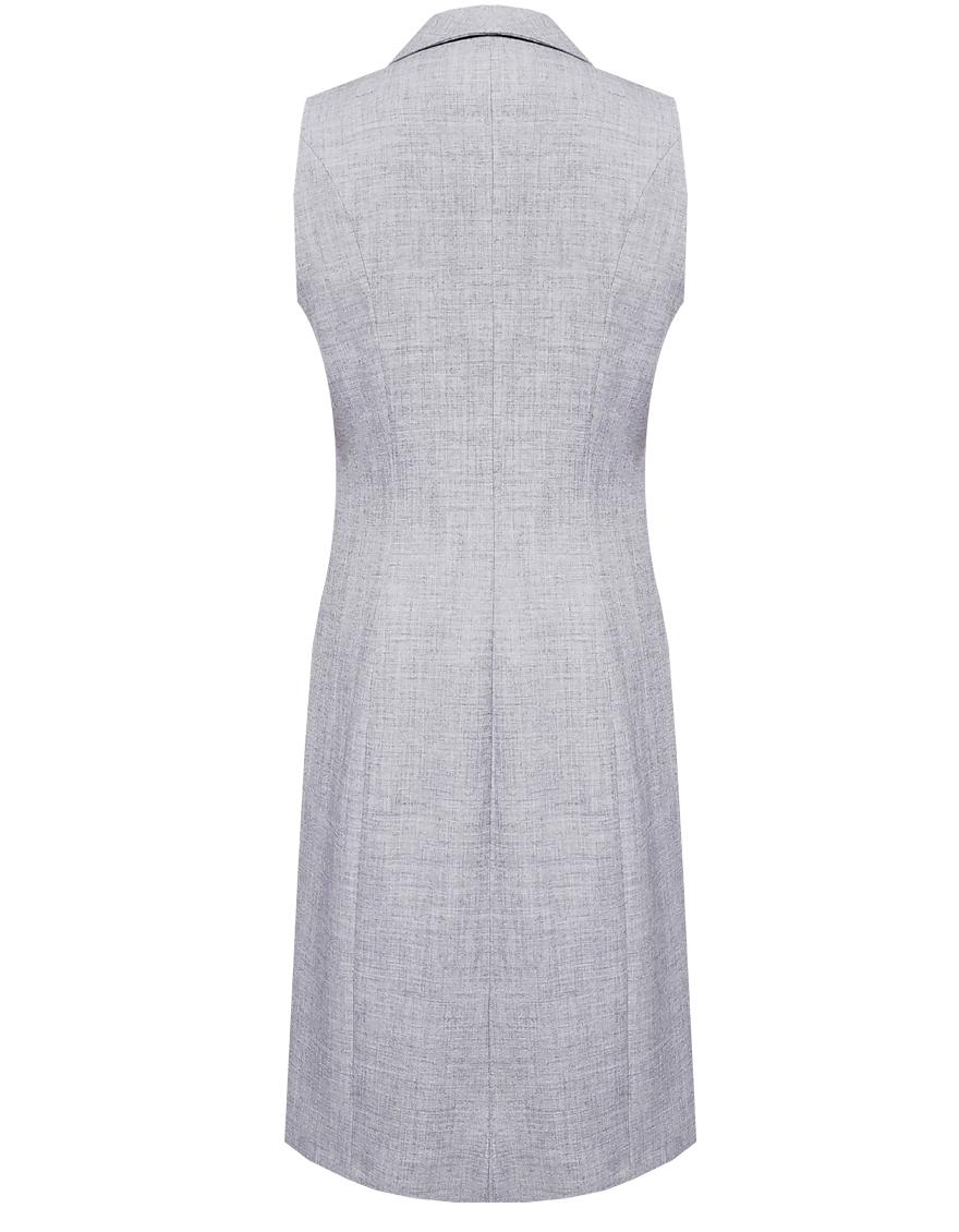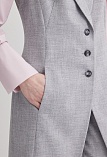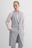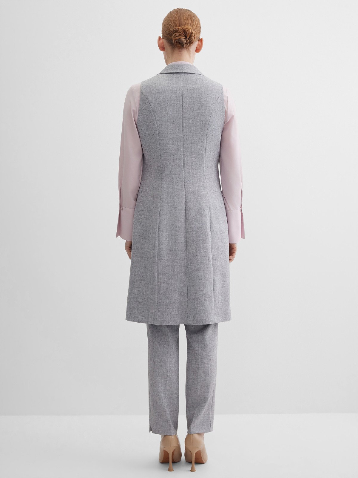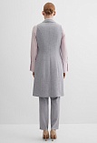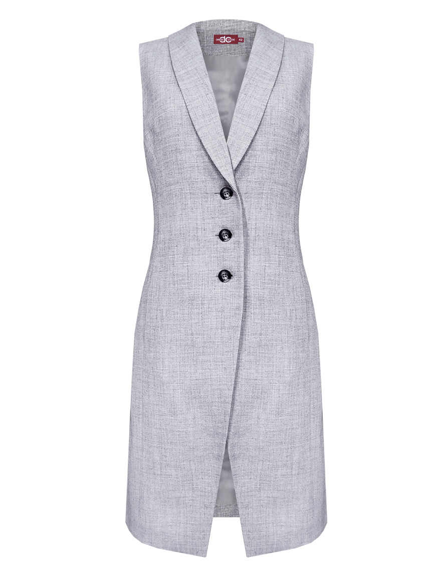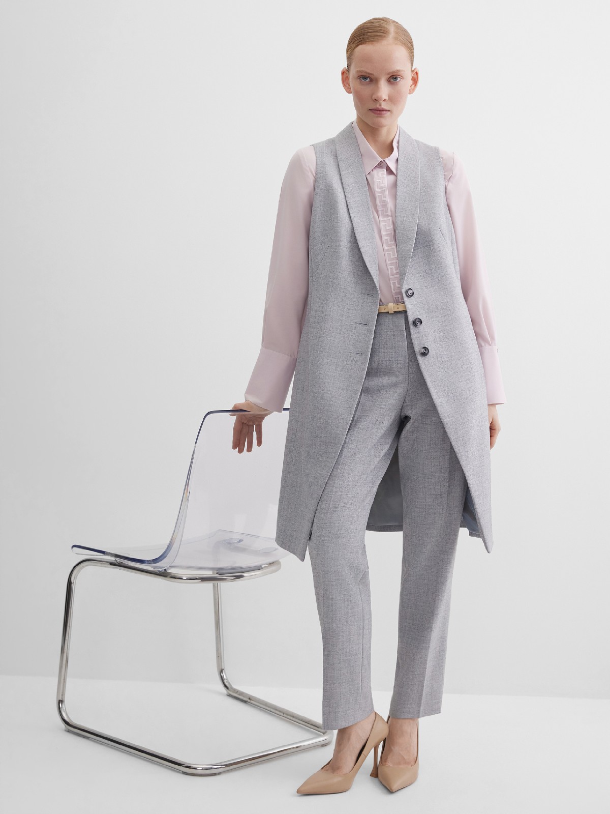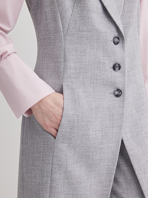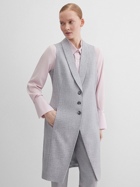 Универсальный базовый жилет из поливискозной ткани в мягком и нейтральном оттенке серого с легким меланжевым эффектом, идеальная длина до середины колена, приталенный, однобортный, горловину украшает шалевый воротник, функциональные карманы в рельефе, которые почти незаметны, застежка на пуговицы, модель на подкладке. Поливискозная ткань -  смесовая ткань , в состав которой входят волокна вискозы и полиэстера, именно полиэстер придает ткани прочность, долговечность и опрятный внешний