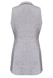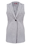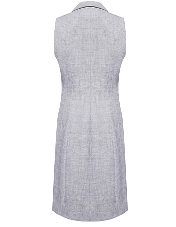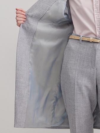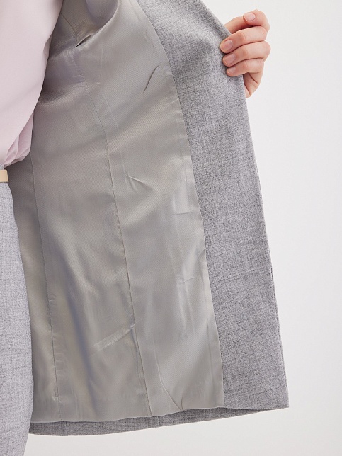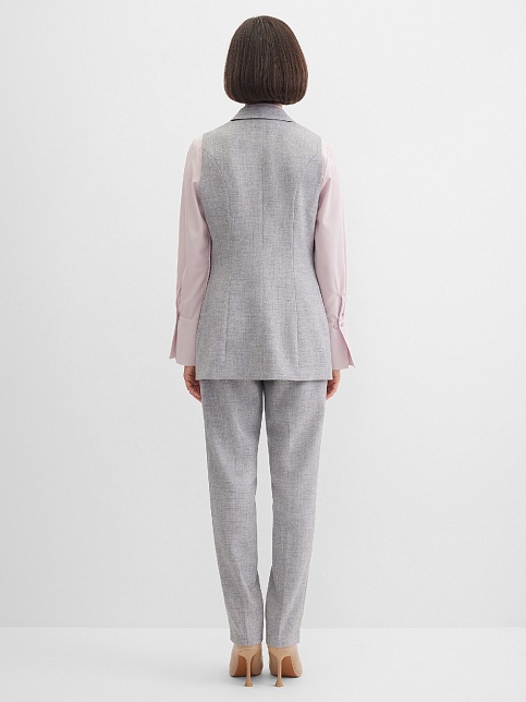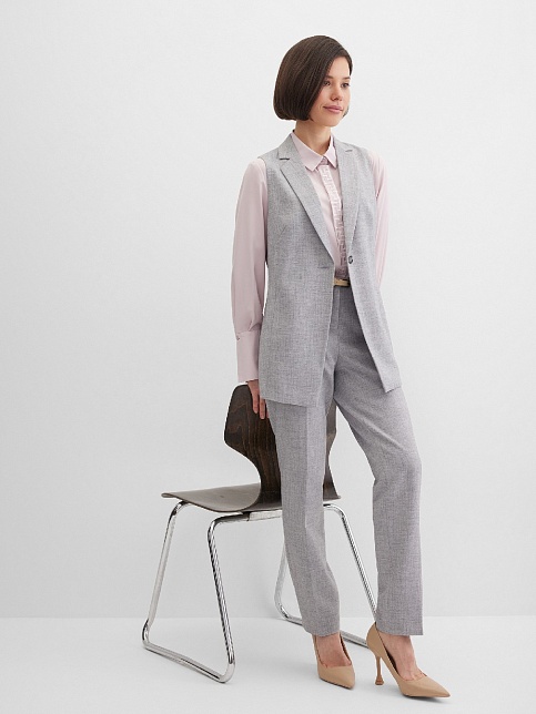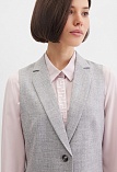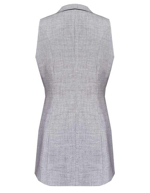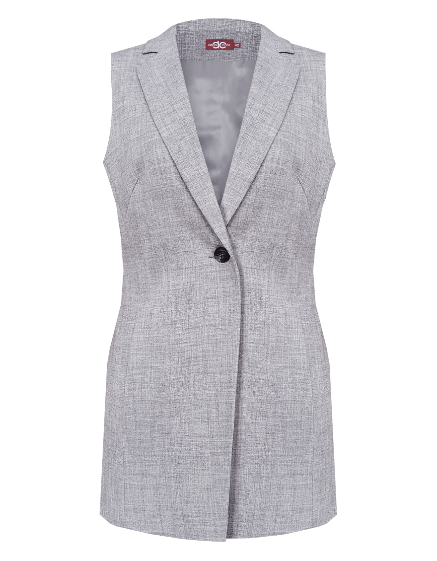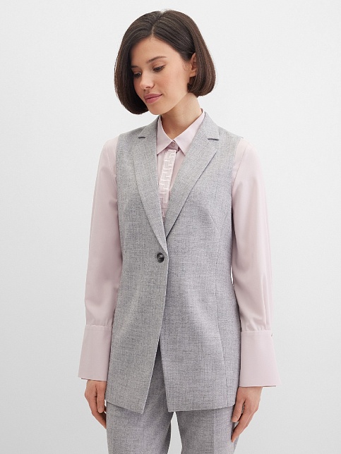 Классический базовый жилет из поливискозной ткани,в мягком и нейтральном оттенке серого с легким меланжевым эффектом, комфортная длина прикрывающая бедра, приталенный, однобортный, английский воротник, аккуратные внутренние карманы в рельефе почти незаметны, выглядят эстетично и не нарушают линии силуэта, застежка на одну пуговицу, модель на подкладке. Поливискозная ткань - смесовая ткань, в состав которой входят волокна вискозы и полиэстера.