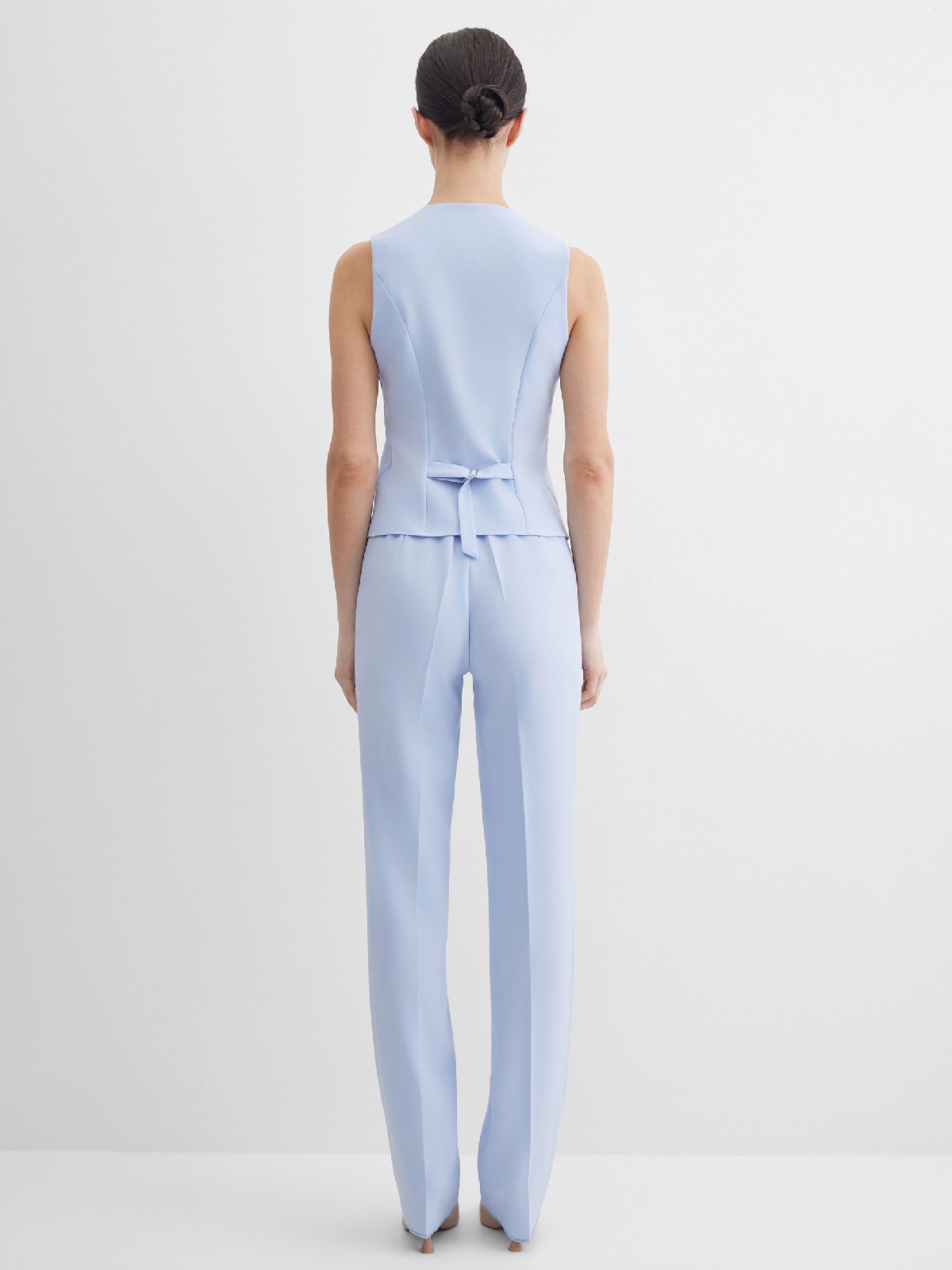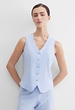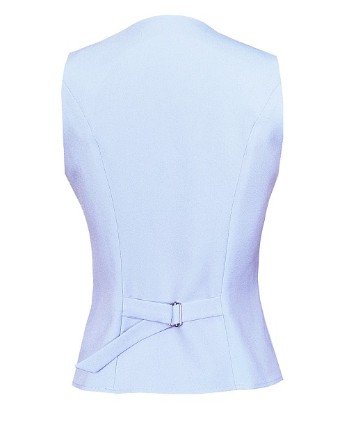 Короткий классический жилет из поливискозной ткани в сложном, пастельном оттенке голубого с холодным фиолетовым или серым подтоном под пиджак или как самостоятельное изделие под любую рубашку или блузку, однобортный, приталенный, застежка на пуговицы, v-образный вырез горловины, хлястики на спинке фиксируются пряжкой и позволяют регулировать ширину изделия по талии, модель без карманов и подкладки.